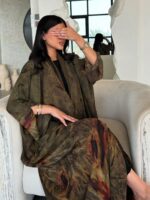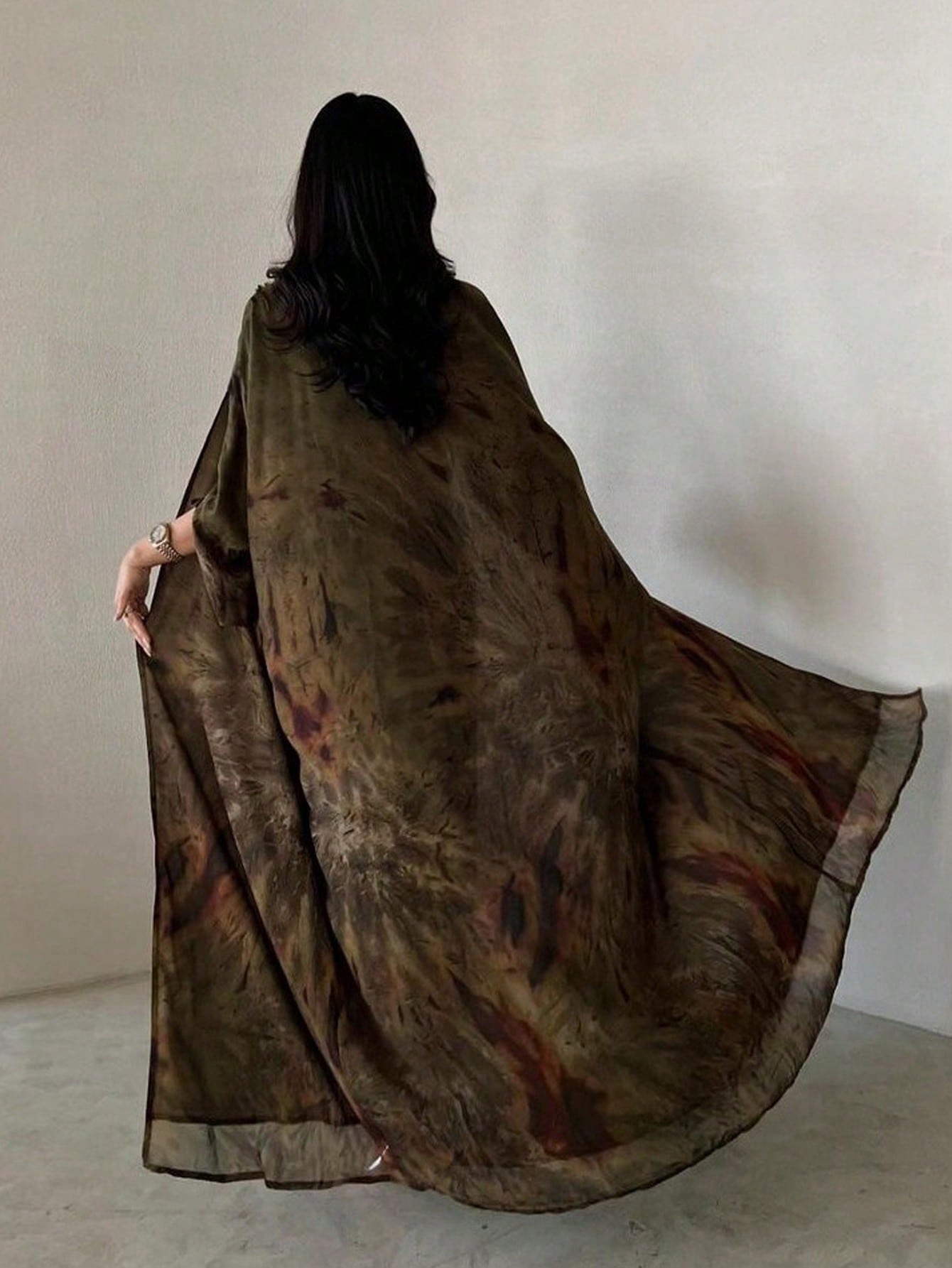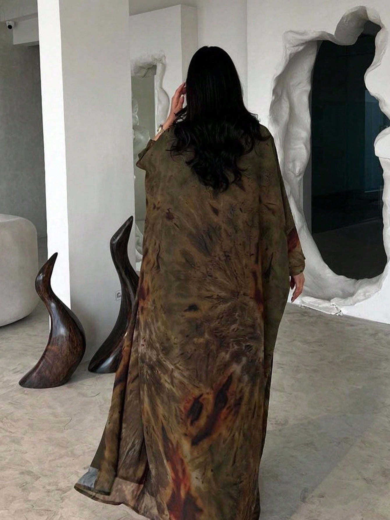 قطعة واحدة من رداء طويل ذو فتحة أمامية من الشيفون الكاجوال أحادي اللون من الفسكوز المصبوغ بطريقة الربط والصباغة، تصميم راقٍ وبنسيج متقن، قفطان متواضع