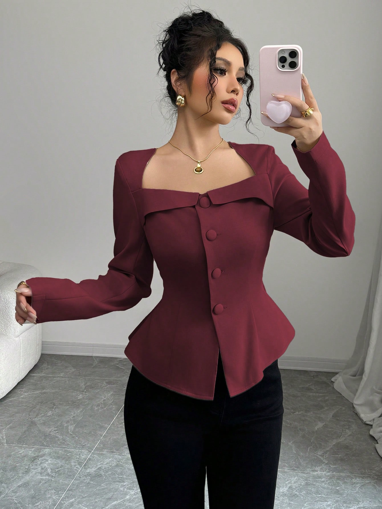 قميص فرنسي يتميز بياقة فرنسية شبه منحرفة وياقة مربعة مزينة بأزرار أمامية، مع خصر مزين وقصة A طويلة تمنح إطلالة أنثوية متجددة. مثالي لموسم الربيع والخريف والشتاء لخروجاتك اليومية أو الرسمية, احصلي عليه من متجرنا nifty-clothing