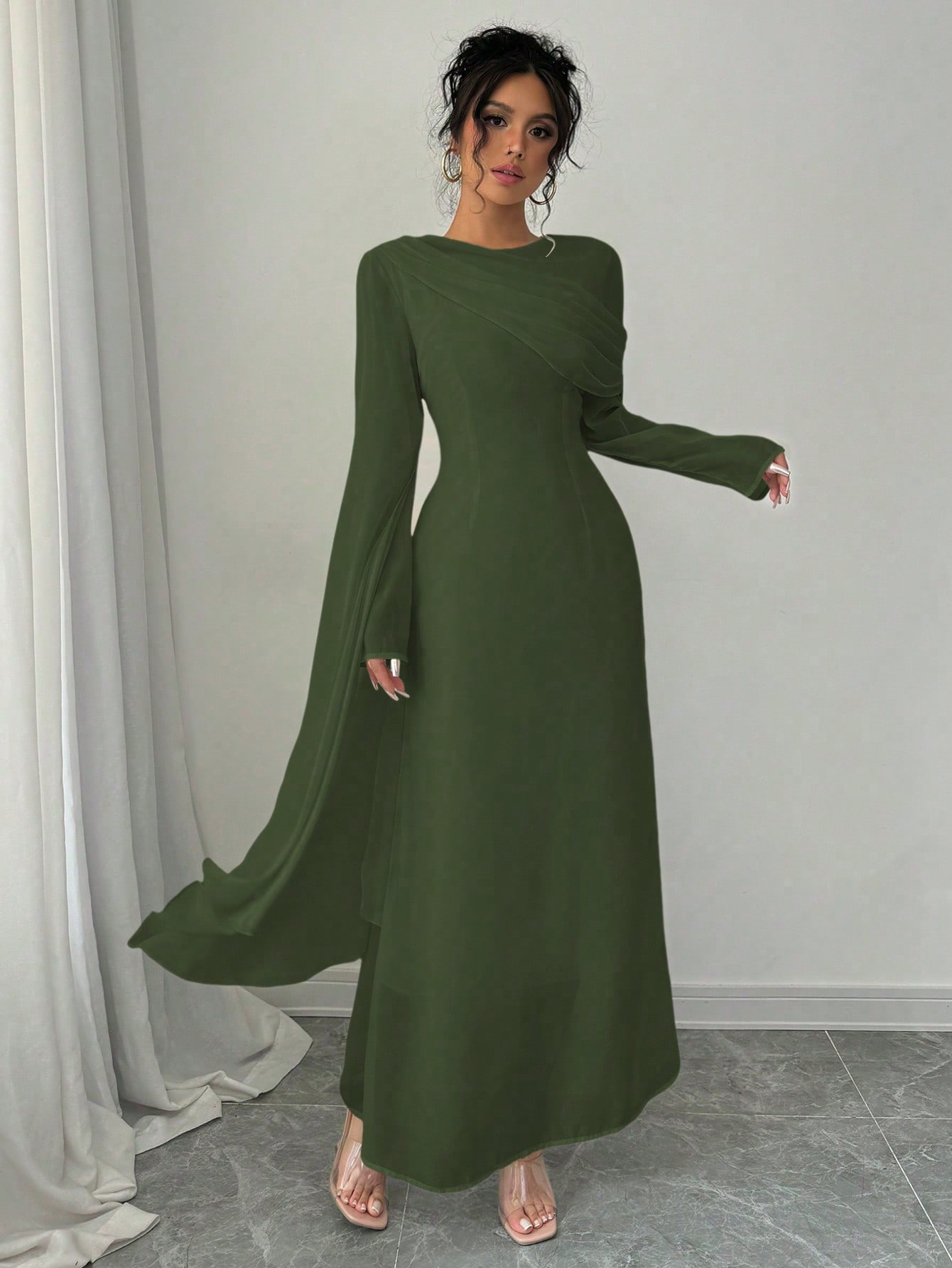 Chiquease فستان أكمام طويلة بياقة عالية وتنورة منحنية حواف غير متناظرة
